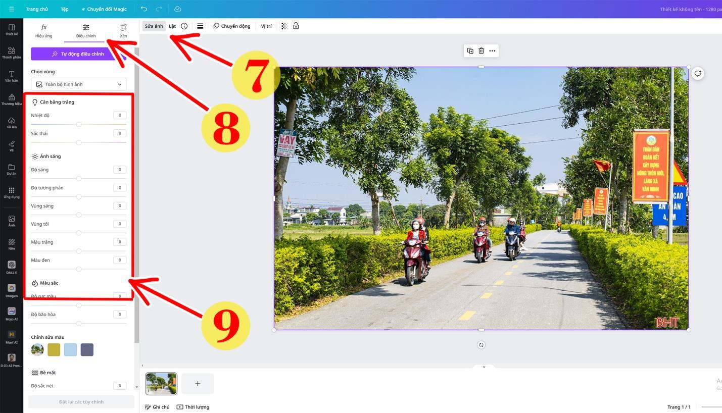 - Bước 9: Kéo các thanh trượt để điều chỉnh: Nhiệt độ, sắc thái (ảnh quá nhiều màu xanh, vàng, đỏ…); ánh sáng, tương phản… để chỉnh ảnh theo đúng ý đồ