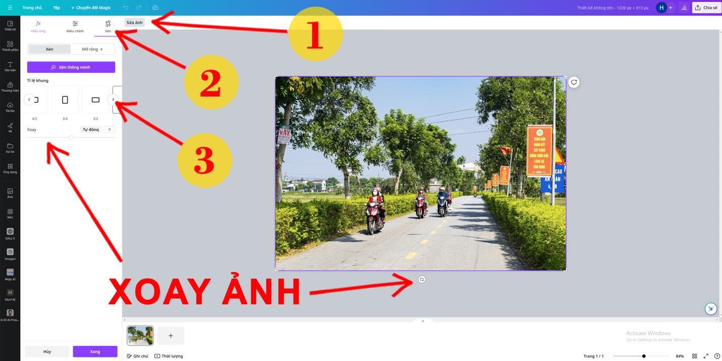 Lưu ý: Dùng công cụ “Xoay” hoặc giữ chuột ở biểu tượng mũi tên xoay 2 chiều phía dưới ảnh để xoay ảnh khi ảnh bị nghiêng, đổ.