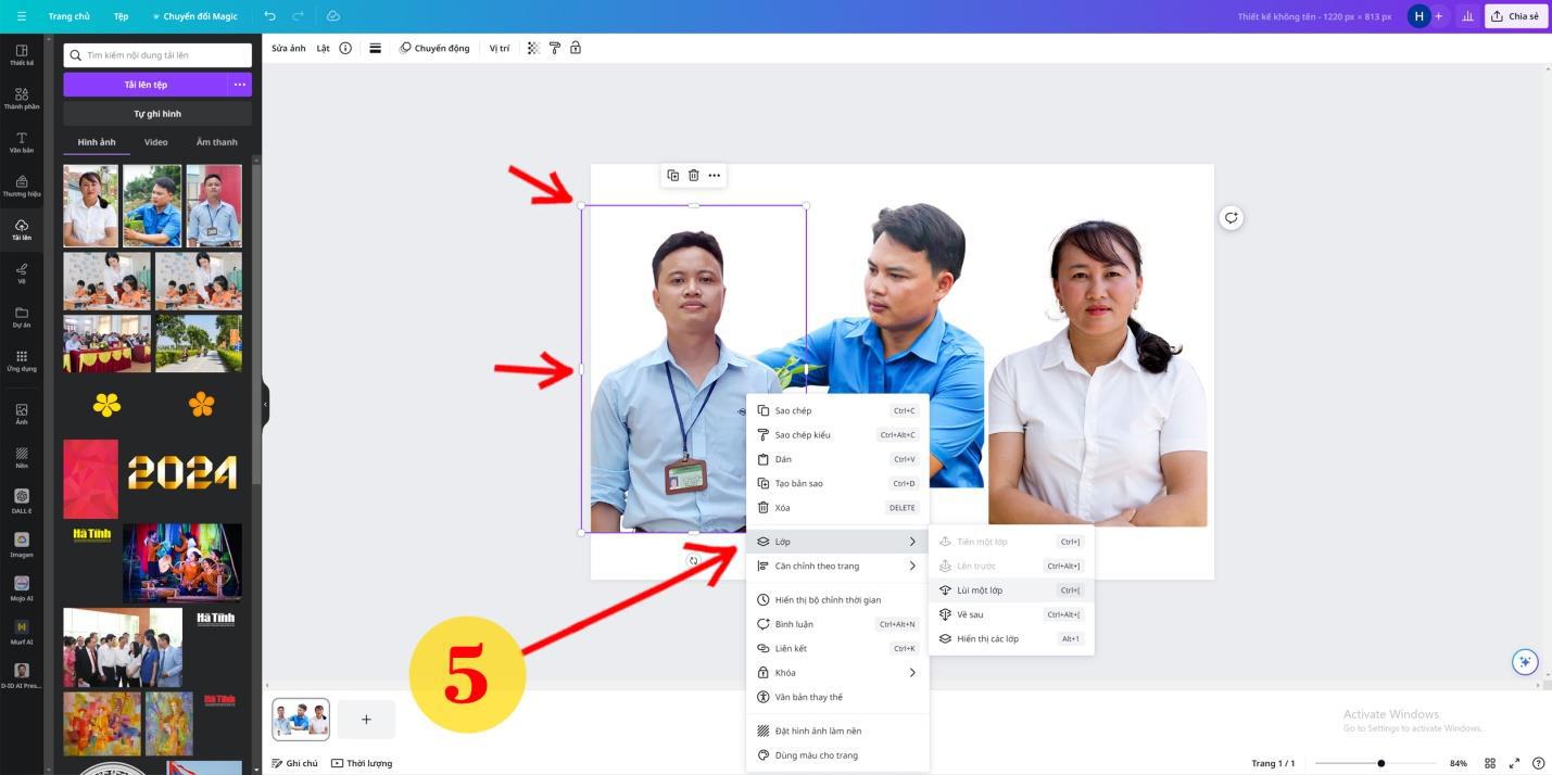 • Cách 1: Click chuột phải vào ảnh cần điều chỉnh => “Lớp” và chọn “Lùi 1 lớp” hoặc “Tiến một lớp” để đưa ảnh lên trước hoặc ra sau